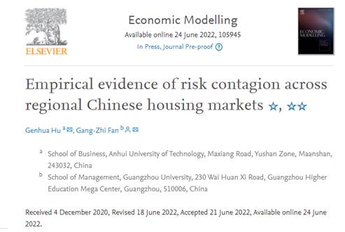 近日,我院胡根华副教授在经济学国际知名期刊《Economic Modelling》在线发表最新研究成果“Empirical Evidence of Risk Contagion Across Regional Chinese Housing Markets” (https://www.sciencedirect.com/science/article/abs/pii/S0264999322001912)。胡根华副教授为第一作者,我校为第一单位,通讯作者为广州大学管理学院樊纲治教授。
