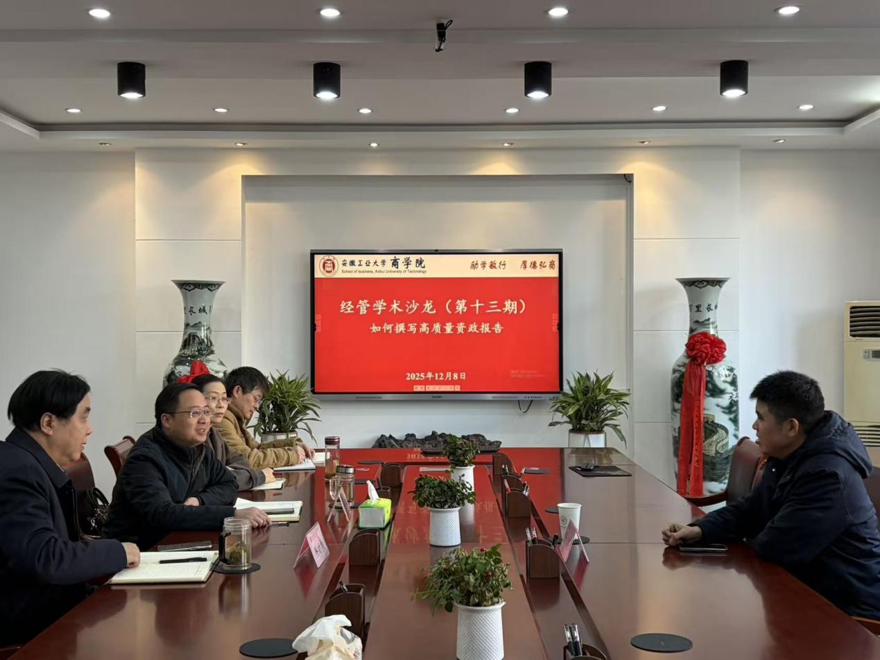 12月8日下午,商学院召开经管学术沙龙(第十三期),会议主题为“如何撰写高质量资政报告”。会议邀请了南京大学长江产业发展研究院陈东研究员莅临指导。安徽工业大学安徽创新驱动发展研究院院长洪功翔,商学院副院长周世军,智库研究人员以及教师代表参会。会议由周世军主持。